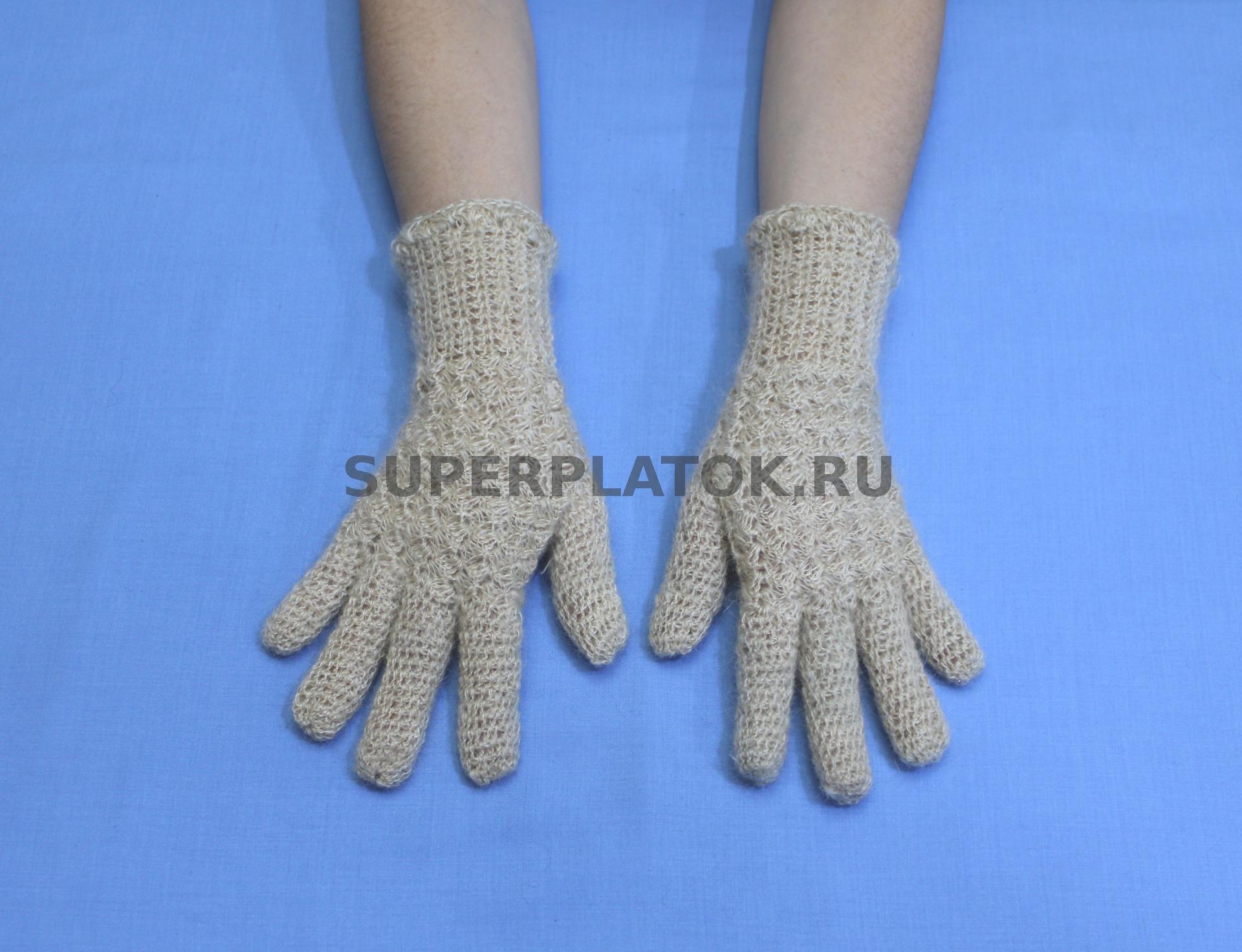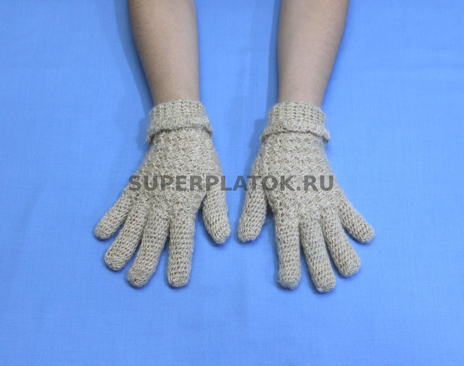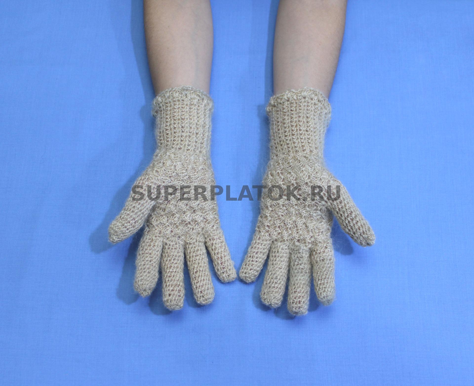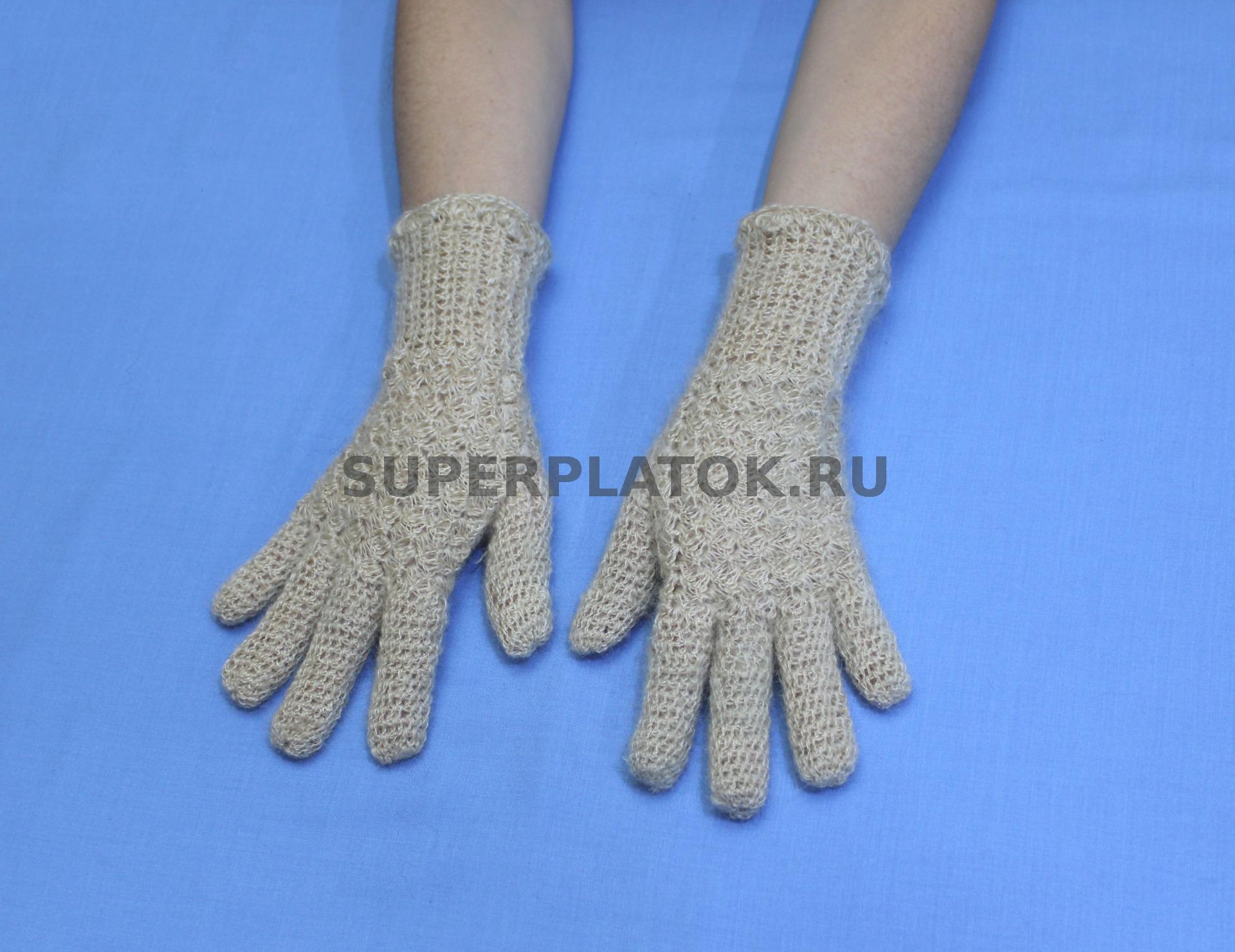 Светло бежевые пуховые вязаные перчатки ручной работы крючком №96С